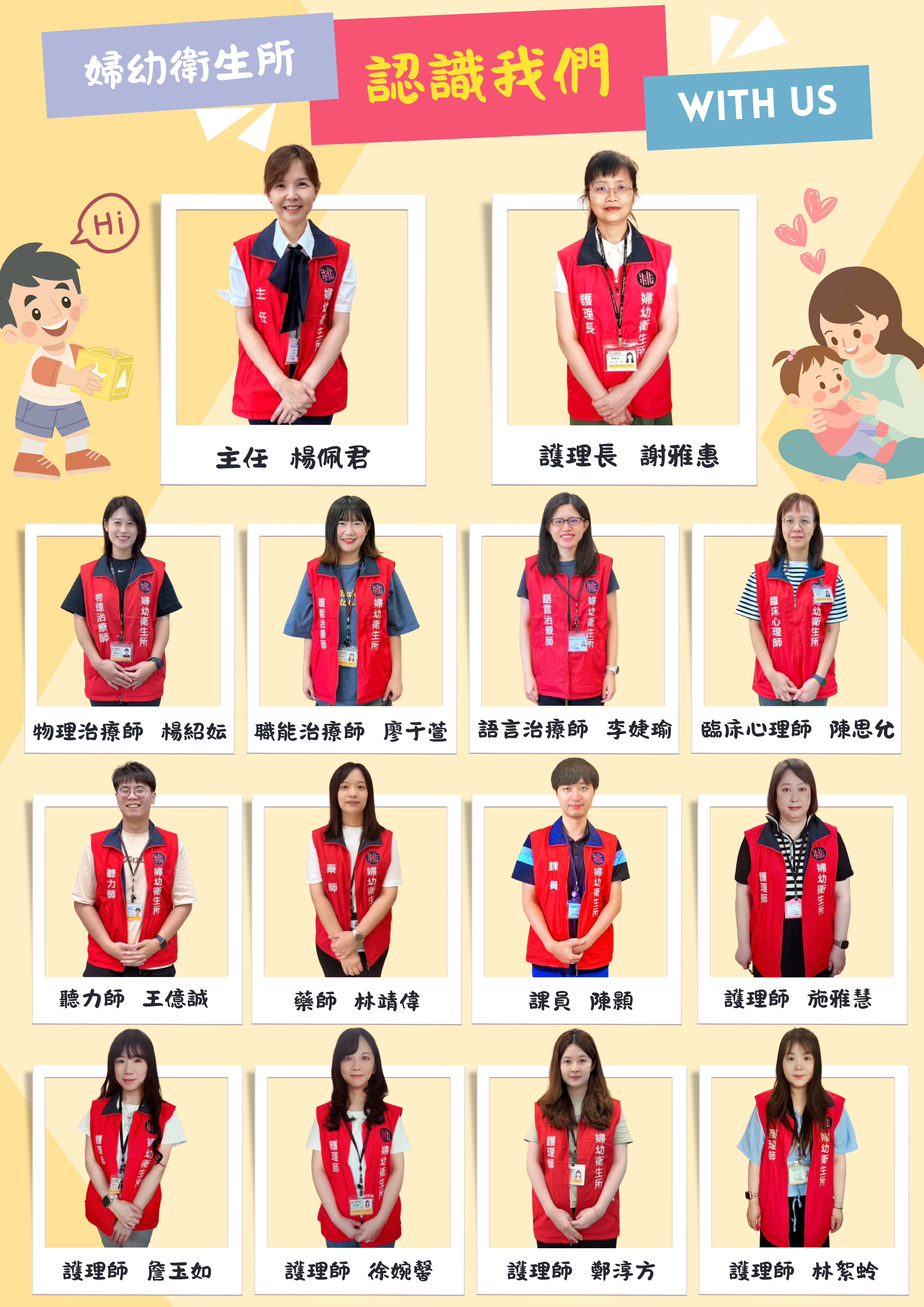 主任(1人)、醫師(2人)、護理長及護理師(7人)、藥師(1人)、物理治療師(1人)、職能治療師(1人)、語言治療師(1人)、臨床心理師(1人)、聽力師(1人)、課員(1人)。